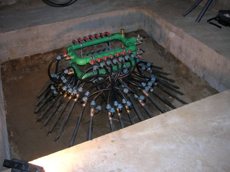 Геотермальные теплообменные подземные петли (зонды) устанавливаются диагонально под углом 300- 450 фактически из одной точки. Распределительный коллектор похож на систему, характерную для геотермальных систем с рассольным закрытым контуром. В отличие от классического использования полиэтиленовых труб низкого давления высокой плотности, материалом для геозондов служит стальная высококачественная труба, погруженная на глубину 11-20 метров. Несомненно, что свойства теплопроводности стали значительно превышают теплопроводность труб РЕ, отсюда эффективность таких геотермальных полей превышает эффективность «пластиковых коллег». Выбор качественной стали основан на разработках немецких инженеров, эффективно применяющих такую технологию. При этом можно утверждать, что система первичного контура прослужит 40-60 лет. Много это или мало? Проверить просто. Добавьте к своему возрасту заявленные года работы геотермальной системы и…….., все понятно.
