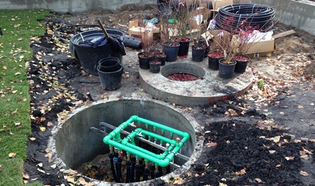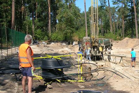 Работы по устройству первичного источника для теплового насоса Ochsner OSWP96 продолжались в течении четырех недель. Три недели заняло бурение скважин, неделя ушла на раскопки и монаж. Всего пробурено 22 скважины по 54 метра. Тепловой насос будет работать в реверсном режиме тепло/холод.