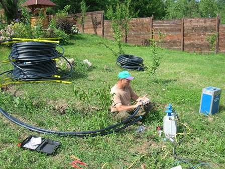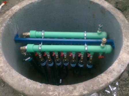 Так выглядел распределительный коллектор. На распределительном коллекторе установлены металлические шаровые краны (коллектор закопан в грунт). Краны бережно замотаны полиэтиленовыми кулечками.