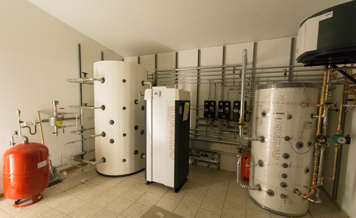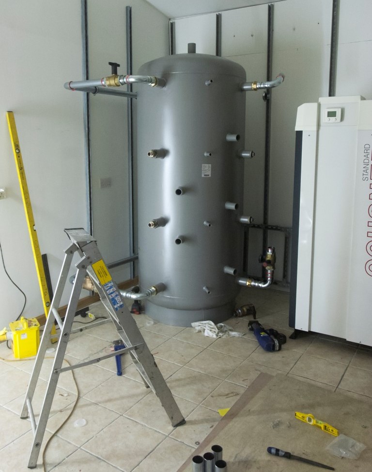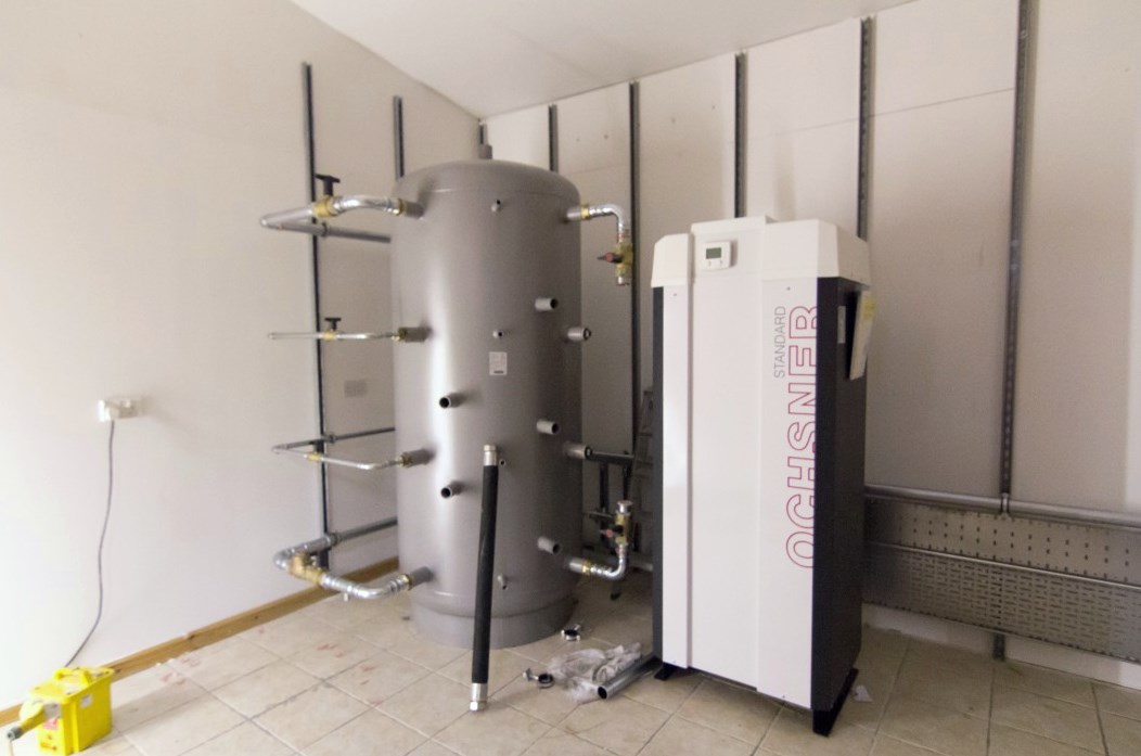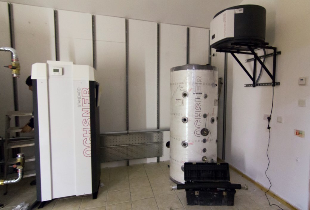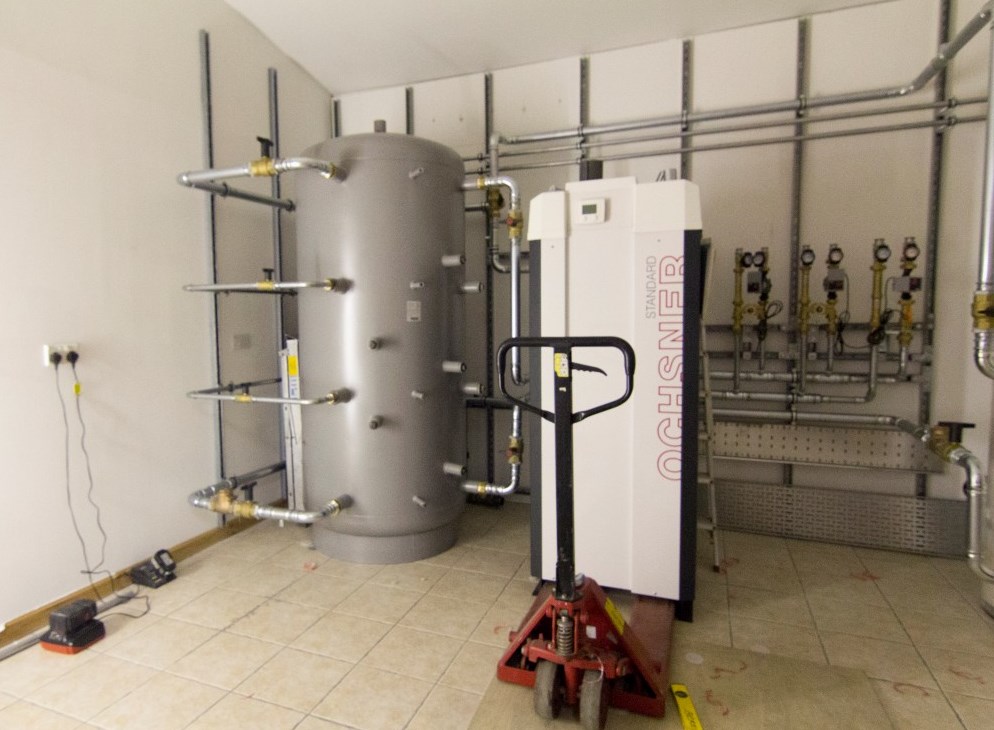 7. Внутренняя работа в котельной в настоящее время почти завершена. Тепловой насос подключен и наши усилия направлены на работы в старом здании. Там мы устанавливаем буферную емкость и бак для горячей воды, которую будет нагревать тепловой насос Europa Mini. Этот буфер системы отопления будет нагревать воздушный тепловой насос Ochsner GMLW 60, мощностью 65 кВт, установленный в главном тепловом пункте.