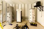 4. На картинке справа, в правом верхнем углу, вы можете увидеть тепловой насос Ochsner Europa Mini IWP, установленный на стене рядом с баком Unifresh . Это устройство предназначено для обеспечения горячего водоснабжения, и имеет тепловую мощность около 2,5 кВт, при потреблении 600 Вт электроэнергии. Она также может помочь охладить помещение, так как забирает теплый воздух из комнаты, а возвращает прохладный воздух обратно . Мы планируем его использовать, чтобы помочь охладить главный зал с открытой планировкой.